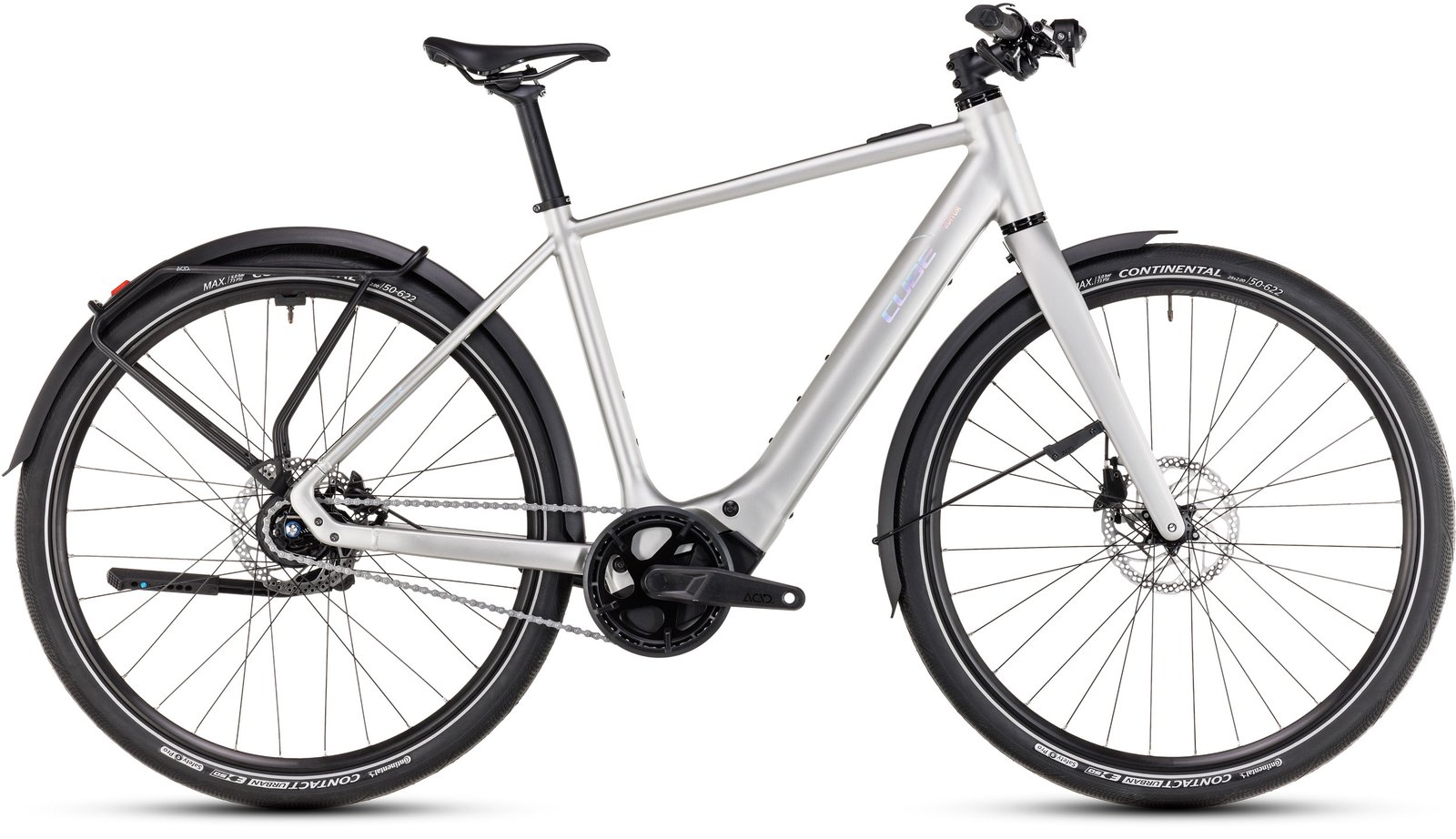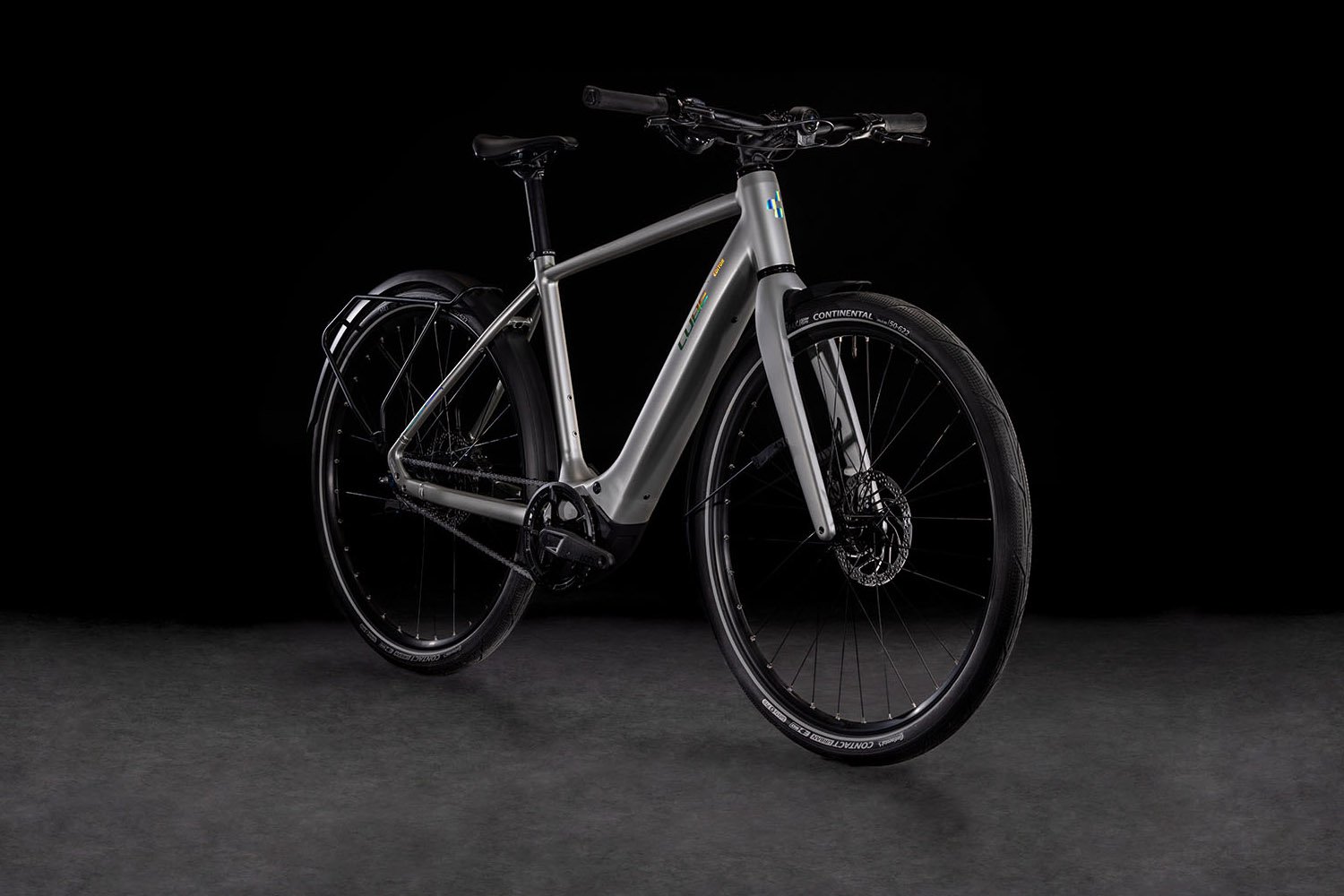 Il telaio di Editor Hybrid FE è così elegante e sobrio che a prima vista sembra quasi una e-bike. La costruzione in alluminio leggero e resistente, con saldature lisce sulle giunzioni dei tubi principali, crea un telaio elegante, mentre la forcella in carbonio integrale è leggera e resistente. Cube ha integrato i cavi per una maggiore durata e un aspetto migliore, mentre la batteria da 400Wh è integrata nel tubo obliquo per risparmiare spazio e peso. C’è un versatile e robusto portapacchi posteriore e un portapacchi anteriore opzionale per trasportare i vostri effetti personali. Inoltre, Cube ha incluso parafanghi completi, un set di luci luminose e un pratico cavalletto, in modo da avere tutto ciò che serve.